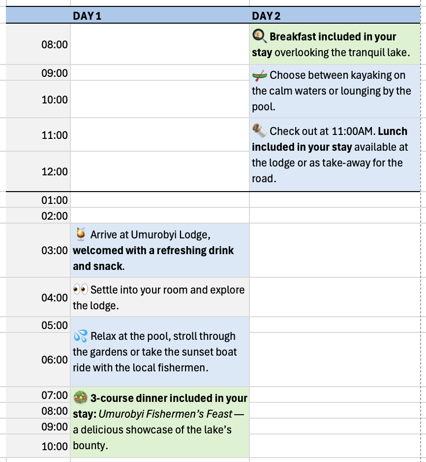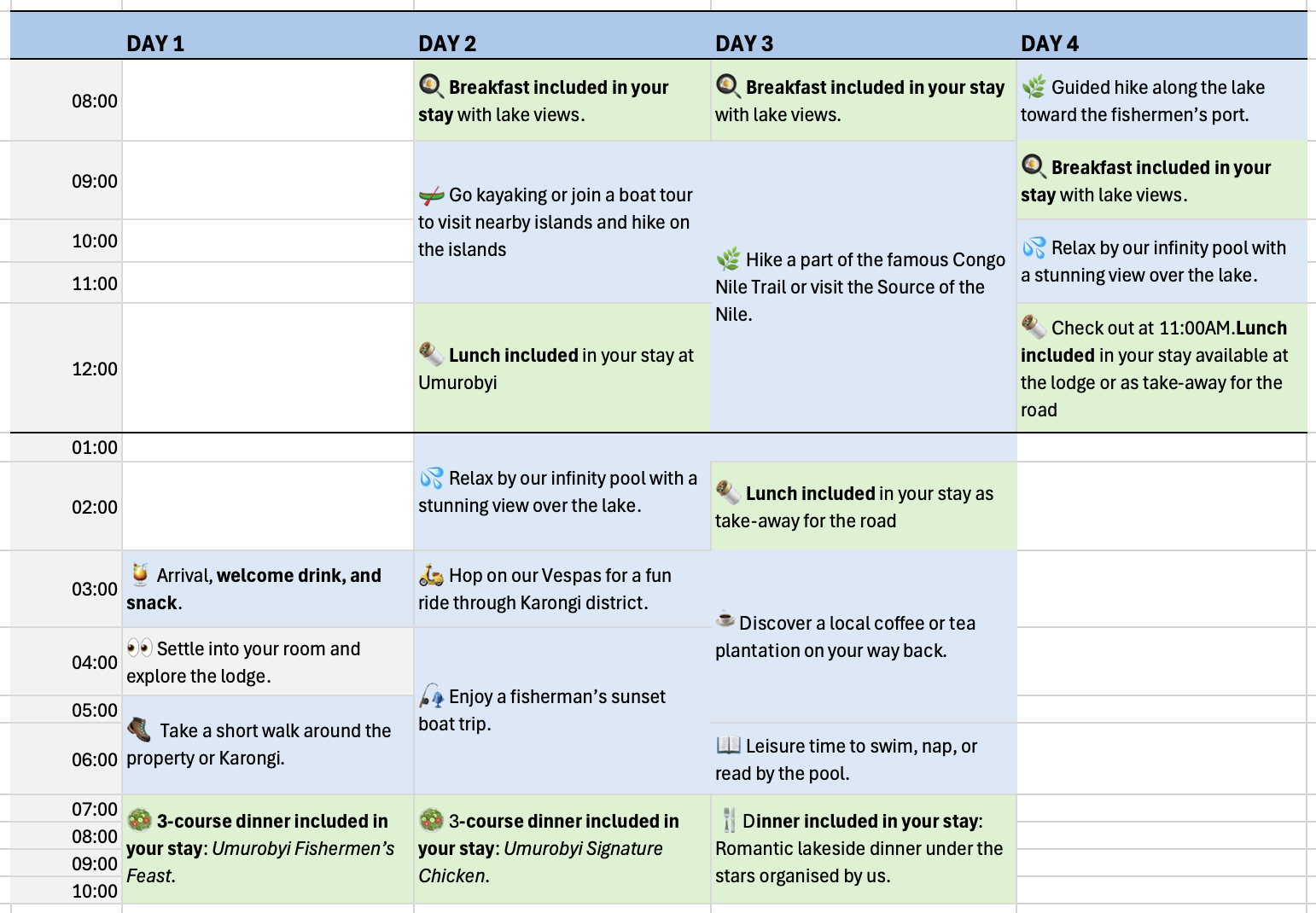 Whether you stay for one, two, or three nights, there’s always something to discover and enjoy at Umurobyi. Here’s a glimpse of what your stay with us could look like.
